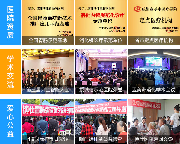 成都博仕胃肠病医院是全国消化内科专家会诊指定单位,是胃肠疾病康复基地,集医疗、预防、科研、保健、体检、康复于一体,以中西医结合、专病专治为特色的医院。一直以来尊奉“诚信医疗、服务百姓”的行医理念,在胃肠病诊疗方面屡创佳绩。除了坚持以中医中药为主,发挥中医优势以外,还注重运用我国传统医学理论指导,融入现代西医精华,中西结合将治病和保健融为一体,不断提升胃肠病诊疗技术水平,服务广大患者朋友。